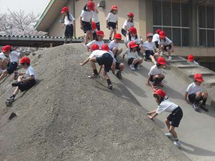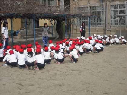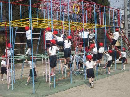 まっさらの体操服,赤白帽で体育の学習をしています。今日は初めてなので並び方と遊具の使い方を練習しています。