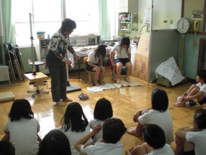 ヒトの体重支えたり、直立二足歩行するために、足の裏がアーチ状になり土踏まずがあります。土踏まずを発達させ足の裏の筋肉を鍛えるために、足の指ジャンケンしたり、タオルつかみを紹介しました。そして足をまもってしっかり運動するために、正しい靴の選び方を学習しました。写真1枚目は「アーチは重さを支えるのに強いの場面。」2枚目は、「足の裏でタオルをつかむ運動をしている。」3枚目は正しい靴の選び方を学習している場面です。