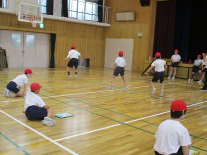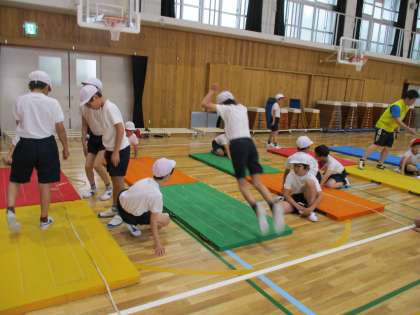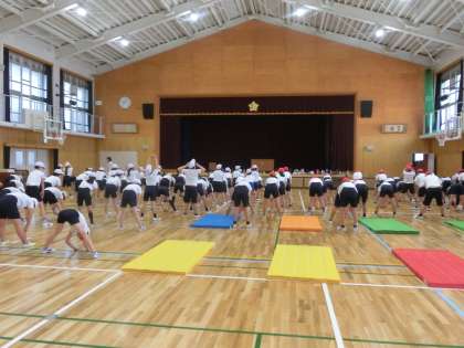 体育館で,反復横跳び・立ち幅跳び・長座体前屈・上体起こし