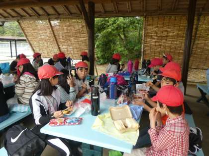 「いただきま〜す!」あずまやで、班ごとにお弁当にパクつきます。ひと口ごとに、みんなの表情が明るくなっていきます。