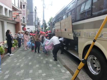 バスに着くと,自分たちの荷物(大きなリュック)をバスに積込みました。