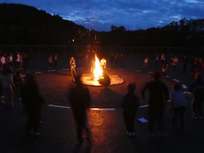 日が落ちて辺りが暗くなった午後7時、火の神・火の精霊の登場でキャンプファイヤーが厳かに始まりました。その後は、歌に踊りにゲームと大盛り上がり!「楽しむべき場面では、とことん楽しもう。」という4年生の姿勢が気持ちよかったです。エンディングには、もう一度火の神が登場し、今夜の集いを静かに締めくくってくれました。