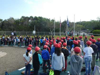 午前7時から、一緒に宿泊している日野小学校と「朝のつどい」を行いました。