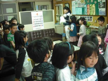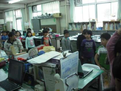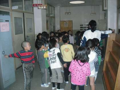 去年は学校探検を2年生のお兄さん,お姉さんに連れられて行ないました。今年は新1年生を学校探検に連れていく番です。どこを回るか,どんな説明をするか,学校中を見て回っています。途中,校長室にも寄ってくれました。