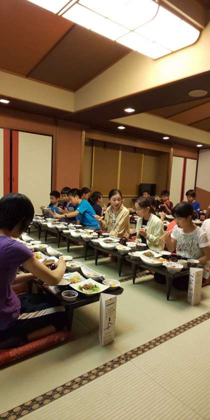 1日の活動で、お腹はペコペコ。味噌カツに焼肉に茶碗蒸し·····。豪華な夕食です。あっちこっちから、おいしい〜!という声が聞こえます。
