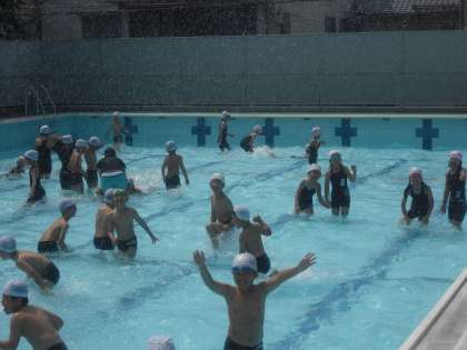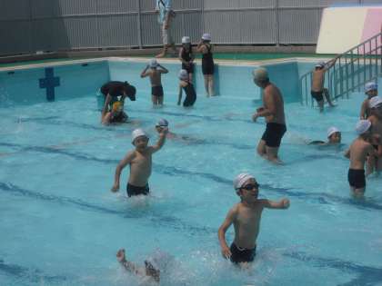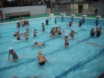 一年ぶりの「プール学習」。今日は絶好のプール日和。入れたての水はちょっと冷たいけれど,みんな笑顔,笑顔。本当に楽しそうです。