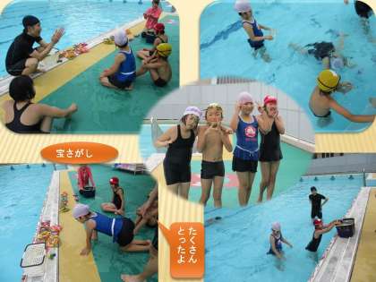 プールで準備体操をし,水慣れのあと,歩く,かけっこ,もぐる、フラフープ列車,宝さがしなどをして楽しく過ごしました。