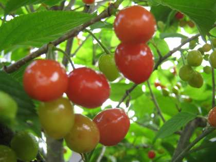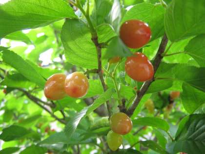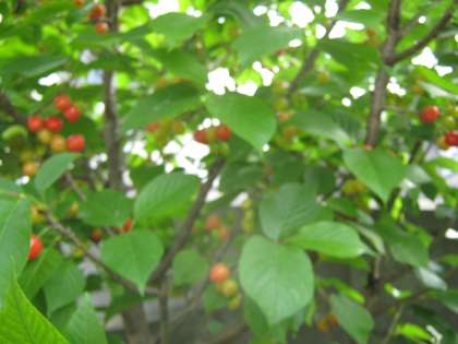 金曜日にはほんのり色づいたサクランボを紹介しましたが,今朝は,もう食べられるほど赤くなってきています。
