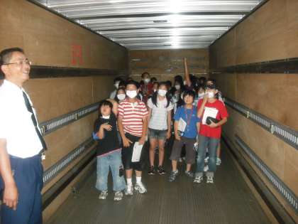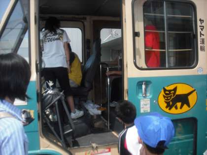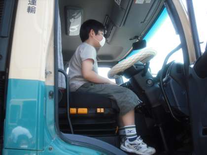 実際に荷物を運ぶトラックにも乗りました。夜中に荷物を運ぶ10トントラックやみんなの家に荷物を運ぶトラックに乗りました。10トントラックの荷台はものすごく大きかったです。