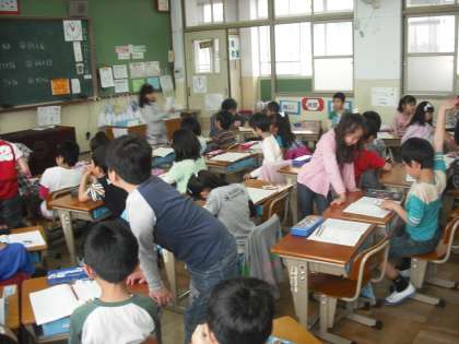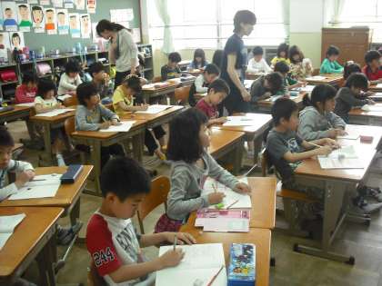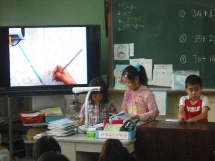 たし算の筆算を学習しています。自分のノートを大きなテレビに映して説明します。