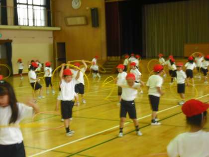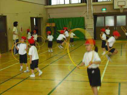 体育館でフラフープを使って,飛んだり回したり,体をいっぱい動かして,運動の楽しさを感じています。