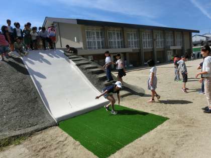 築山滑り台の新たな歴史が始まりました。安全に気を付けて,これから楽しんでください。