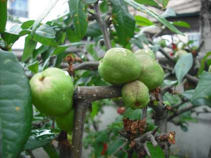写真の実は何でしょう。これはボケの実です。花が終わり実ができてきました。実が瓜に似ており,木になる瓜で「木瓜(もけ)」とよばれたものが「ぼけ」に転訛(てんか)したとも,「木瓜(ぼっくわ)」から「ぼけ」に転訛したも言われています。バラ科の植物です。
