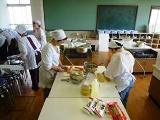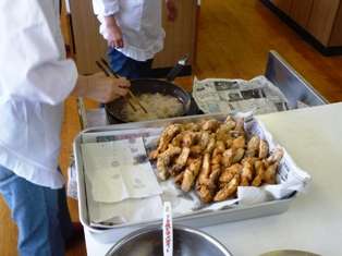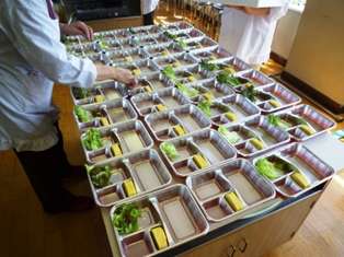 毎月第2土曜日は「配食サービス」の日です。今年度も、ボランティアさんの方々が、早朝よりおいしいお弁当を作ってくださいました。今日のメニューには、学校の木にできたサクランボの実も添えられています。