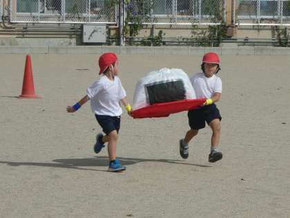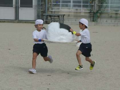 1年生が、団体競技「おむすびころりん すっとんとん」の練習をしていました。ダンスを披露したあと、おむすびをお皿に乗せてリレーします。精一杯 取り組む様子と、声をからしての応援に胸が熱くなります。