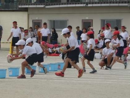 ラグビーボールをトライしてから、フラフープをくぐりゴールを目指します。W杯日本代表に負けじと頑張ります。