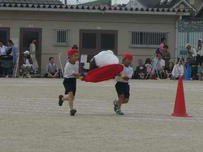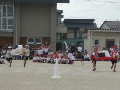 おじいさんが転がしたおむすびを、ねずみたちに扮した1年生がリレーします。途中 お皿から落ちそうになって、おっと危ない!