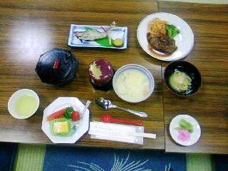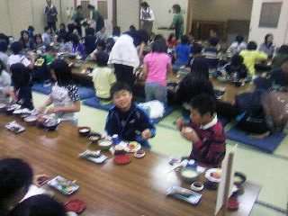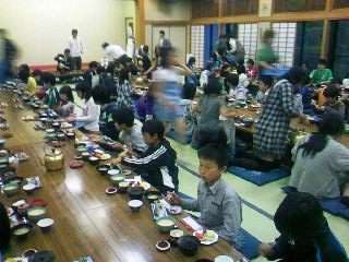 大広間に集まって、夕食をいただきました。上の写真は夕食の献立です。みんなの大好きなハンバーグやスパゲティー、そして、おいしそうな鮎の塩焼きなどが出ました。