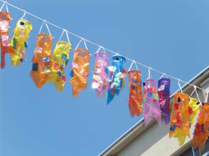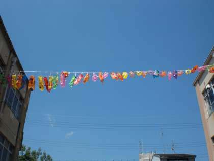 仲よし学級は,1年生と協力してたくさんのこいのぼりを作りました。そのこいのぼりたちはみんな仲よく中庭で泳いでいます。今日はお天気もよく一層気持ちよさそうです。