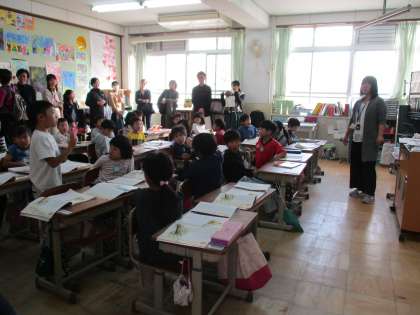 くまに親切にされたおおかみの気持ちを考えるのに,おおかみになりきるためにお面をつけて,クマ役の先生と言葉をかけあいました。