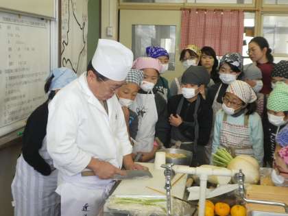 “近又”の大将 鵜飼さん・食育指導員のみなさんに来校いただき、昆布だしと合わせだしを試飲させてもらったあと、それを使った料理(聖護院かぶらとおあげの炊いたん・生湯葉の奉書巻きのお吸い物)を作りました。