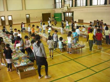 今年も選書会が開かれています。体育館いっぱいに並べられた本の中から,図書室に置いてほしい本を選びます。選んだ本にはカードをはさんでいきます。さて,どんな本が選ばれるかな?