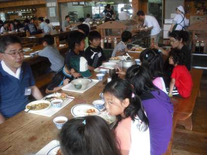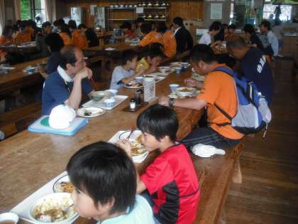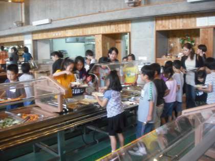 いよいよ昼食です。自分の好きなメニューを選び,おかずはバイキング形式です。運動しておなかがすいてたのか,みんなたくさん食べています。