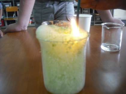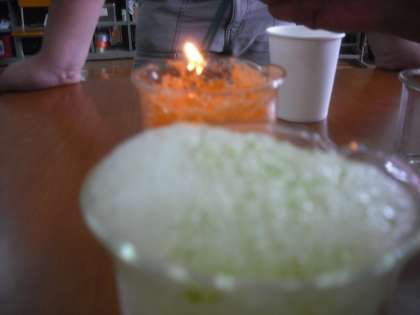 今日は4・5・6年の理科を担当している毛利先生が教室を訪れて,「サプライズ実験」をしてくれました。ニンジンとキュウリをすりおろしたものに,過酸化水素水をいれると……。あらっ,ふくらんだ,ふくらんだ。これだけでもびっくりなのに,線香を近づけると…,パッと音がして,炎が出ました。またまたびっくり!!実は酸素が発生したんですね。楽しくて,びっくりの実験,ありがとうございました。