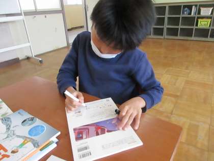 その後,新しい教科書も受け取って,いろいろなページに興味津々。大切な教科書,名前もていねいに書いていました。