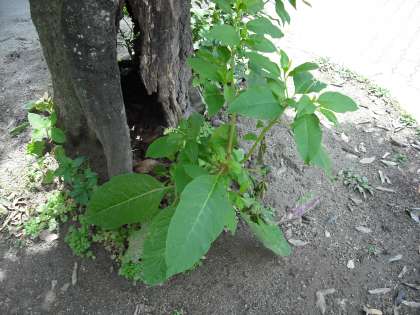 「ヨウスヤマゴボウ」が出てくる季節ですね。学校でも出てきました。熟した実はちょっと厄介です。潰すと赤紫色の果汁が出ます。この果汁は強い染料で,服や人に付くとなかなか落ちません。この特性のため,アメリカではインクベリー(Inkberry)とも呼ばれています。毒性があるため,学校では抜いてしまいますが,近所で見つけても,触らないようにしましょう。