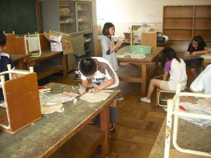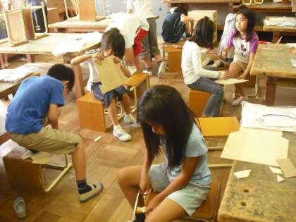 糸のこや電動糸のこを使って,1枚の板を工夫して廃材が少なくなるように「マグネットボード」を作っています。どんなマグネットボードができるか楽しみだね。