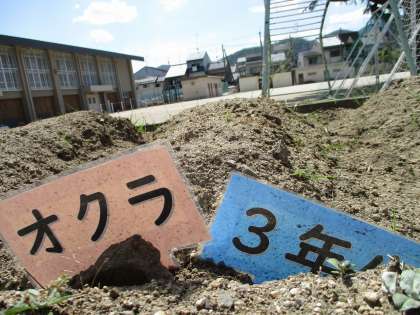 出ました!さっそく,芽が出ましたよ!うれしいので,すぐ報告します。1枚目はヒマワリ,2枚目はダイズです。オクラはまだのようなので,うね だけのせておきますね…。