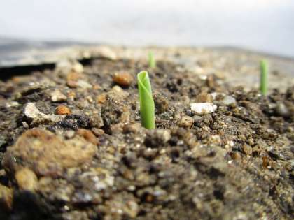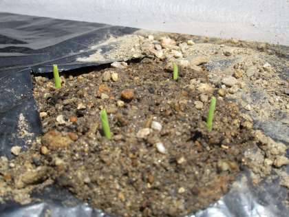 このところのあたたかさで,たねも元気が出たのでしょう。黒いシートのあなに,4つずつまいたのが,4つともちゃんと芽を出していました。近づいてよく見ると,こんな形。細長い葉が,クルッとまるまったような芽ですね。太陽をたくさんあびて,ぐんぐん育ってね。うれしいお知らせでした。