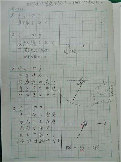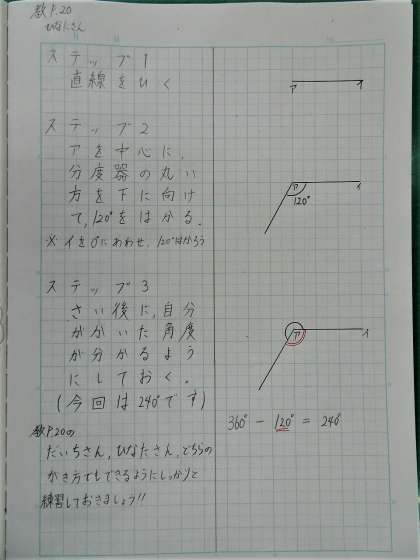 さて,みなさんに出してもらったワークを見ていると,一生けん命取り組んでいる様子が分かり,先生たちもうれしいです。でも,難しかった部分もありましたね。そこで,今回は難しかった「180°をこえる角の大きさ」のかき方をまとめてみました。明日,配布のか題といっしょにお渡ししますね♪