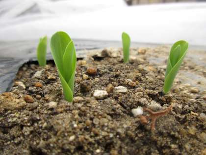 きのう,仲よしの畑で「なぞのたね」の芽が出たとお知らせしましたね。左の写真がきのうの芽で,長さが1ミリメートル2ミリメートルでした。