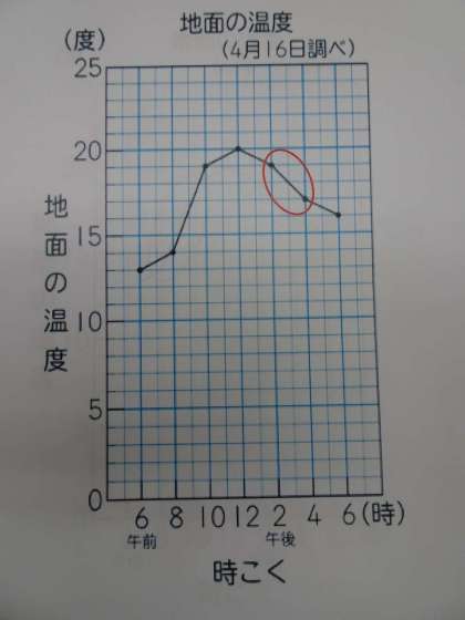 では,『地面の温度の下がり方がいちばん大きいのは…?』下の写真を見てください。かたむきに注目すると,「午後2時から午後4時までの間」が一番かたむきが急ですね。細かくグラフを見ると2度,気温が下がっています。