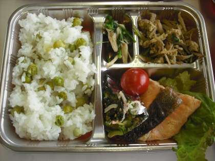 おいしいお弁当ができま上がりました。今日は豆ごはんです。