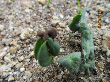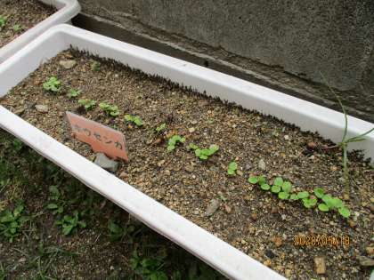 1まい目がヒマワリです。土の中にうめたはずのタネがこんなところに姿(すがた)を見せてくれています。前回芽が出ていなかったオクラも,力強く芽を出していますよ。