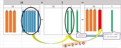38+3の計算のしかたをかんがえてみましょう。