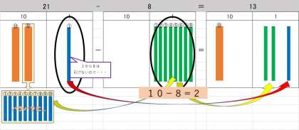 20−8のこたえに,1をたすので,ひき算なのにたし算をするというまぎらわしいことに・・・。