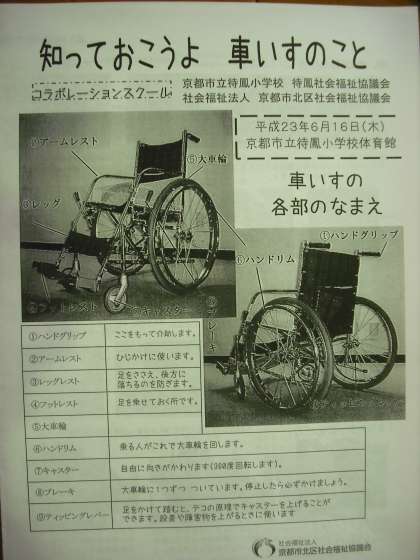 4年生では総合的な学習の時間に福祉について学習を進めています。今日は,体育館で「車いす体験」をします。待鳳社会福祉協議会や北区社会福祉協議会,ボランティアさん,PTAの皆さんのお手伝いを頂いて行います。