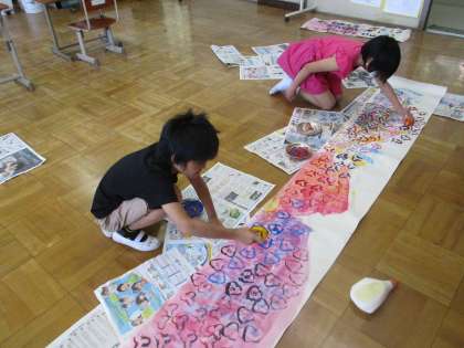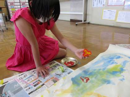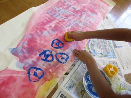 絵の具の淡い色で下地に色を着けた長い紙に,2人それぞれが思い思いの場所や色でスタンプを重ねていきます。一旦始めると,「これ楽しいなぁ!」となんだかリズムよく楽しくなってきて止まりません。