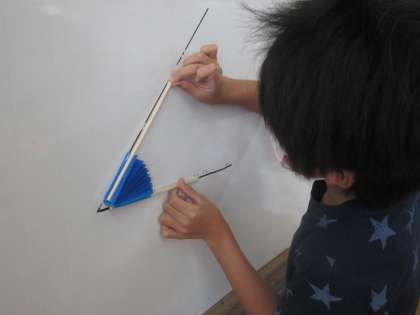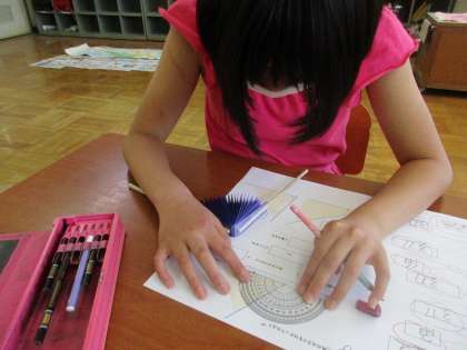 仲よし学級の算数では,「角とその大きさ」の学習に取り組んでいます。折り紙で作った「まるく開く扇」を使って,校内のいろいろな部分の「角の大きさ」を調べたり,分度器を使っての角度の測り方を学習したりしています。
