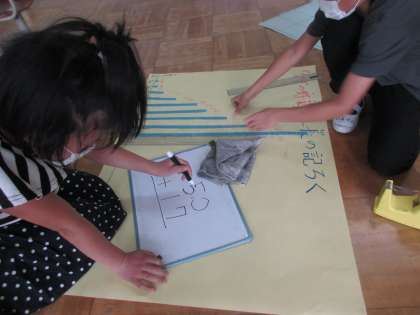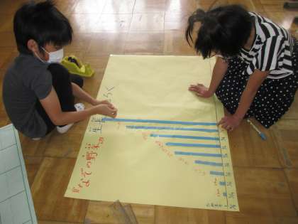 先日まで,夏のような日差しが降り注いでいて,仲よし学級の畑の野菜もぐんぐん生長しています。仲よしの2人は,登校した日には毎日水やりをして,高さを測っています。「なぞの野菜」も見るたびに大きくなっている気はするけれど,どれくらい伸びているのかひと目でわかるといいなぁ・・・ということで,紙テープで長さを測り取り,それを模造紙に貼ってグラフにしています。