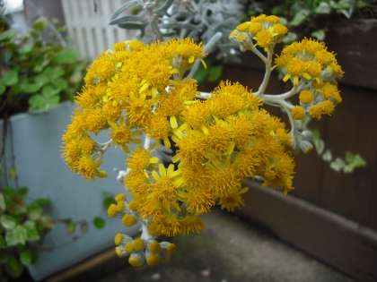 シロタエギクの黄色い花が咲いています。もとのと白い毛に覆われた葉を観賞するための草花ですが,単独で植えてもあまり美しくなく,冬花壇にハボタンやパンジーなどと植えてそれらを引き立たせるために用いられることが多いですね。