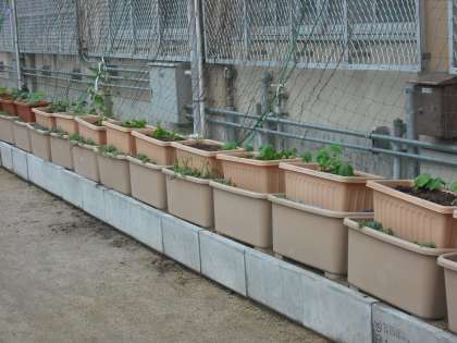 今年も南校舎の運動場側に緑のカーテンを作っています。今年はオーシャンブルー,ゴーヤ,ヘブンリーブルーで挑戦しています。暑い夏に,少しでも節電ができるといいですね。