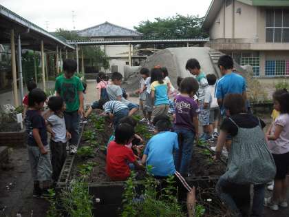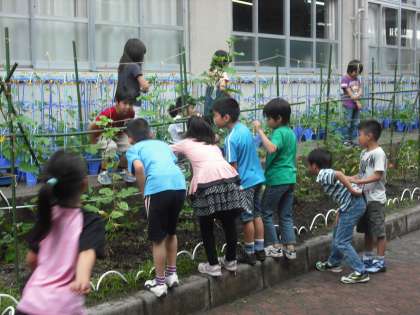 サツマイモや夏野菜の観察中です。トマトやキュウリができてるよ。