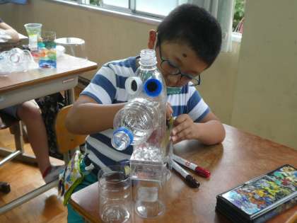 3年生の図画工作の授業です。透明のプラ容器を使って,動物を作ります。プラ容器の形から,何をイメージするかがポイント。ゼリーのカップが目になったり,卵パックが背びれになったり…。子どもたちの想像力には,本当にびっくりさせられます。