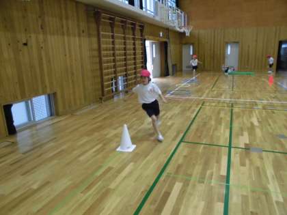 今週も体育がある日に限って雨が多かったので,17日(金)の体育の学習は体育館で跳び遊びをしました。ソーシャルディスタンスを考えて跳んだり,回ったり,走ったりしました。