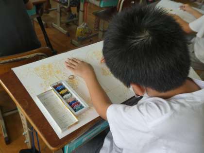 4年生が図画工作の時間に,物語のすきな場面の様子を想像して描いていました。場面に合う描き方を工夫します。